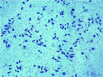 实验原理:将细胞种于上室,趋化因子等种于下室,细胞会向营养成分高的下室跑。与迁移实验不同是侵袭实验需要在小室聚碳酸酯膜上铺设一层基质胶。用以模仿体内细胞外基质,细胞欲进入下室,先要分泌基质金属蛋白酶(MMPs)将基质胶降解,方可通过聚碳酸酯膜。计数进入下室的细胞量可反映肿瘤细胞的侵袭能力。