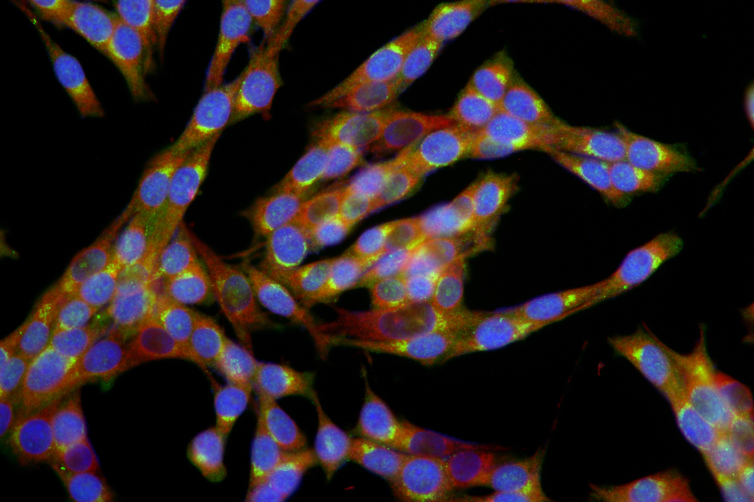免疫荧光技术是根据抗原抗体反应的原理,先将已知的抗原或抗体标记上荧光素,制成荧光抗体,再用这种荧光抗体(或抗原)作为探针检测组织或细胞内的相应抗原(或抗体)。在组织或细胞内形成的抗原抗体复合物上含有标记的荧光素,利用荧光显微镜观察标本,荧光素受外来激发光的照射而发生明亮的荧光(黄绿色或橘红色),可以看见荧光所在的组织细胞,从而确定抗原或抗体的性质、定位,以及利用定量技术测定含量。