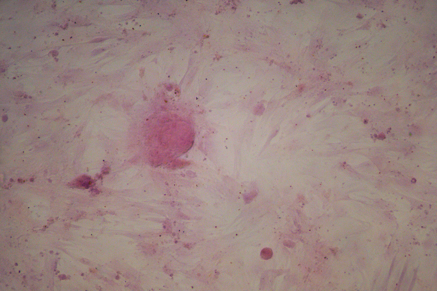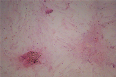 3.染色原理:茜素红与钙发生显色反应,产生一种深红色的带色化合物,这样成骨诱导的细胞外面沉积的钙结节也就被染成了深红色。.