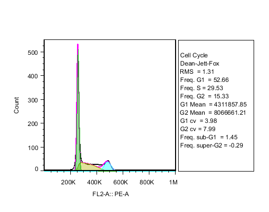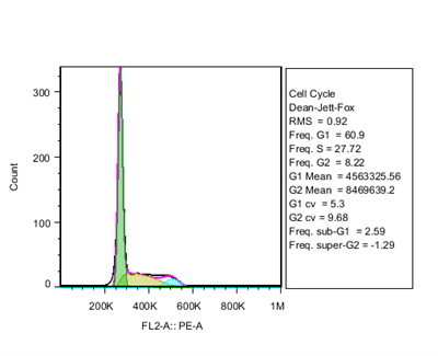 细胞内的DNA含量随细胞周期进程发生周期性变化,如G0/G1期的DNA含量为2C,而G2期的DNA含量是4C。碘化丙啶( Propidium,简称PI)是一种双链DNA的荧光染料。碘化丙啶和双链DNA结合后可以产生荧光,并且荧光强度和双链DNA的含量成正比。假定G0和G1期的细胞荧光强度为1,那么G2和M期的细胞的荧光强度为2,S期的细胞介于1和2之间。细胞凋亡时,由于细胞核皱缩和DNA片段化,染色时DNA片段会从打孔的细胞膜处丢失,流式细胞仪检测时,荧光强度小于1,即Sub-G1峰或者凋亡细胞峰。
