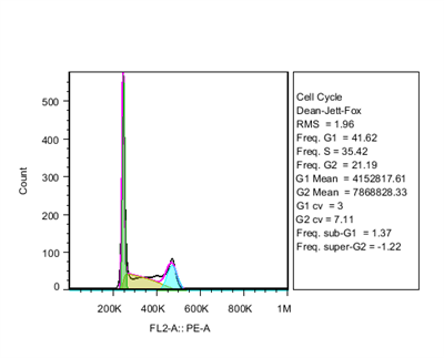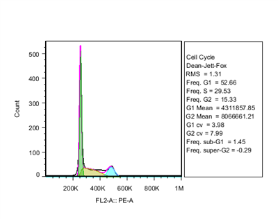 细胞内的DNA被碘化丙啶染色后,可以用流式细胞仪对细胞进行DNA含量测定,然后根据DNA含量的分布情况,可分析细胞周期各时相的百分比。