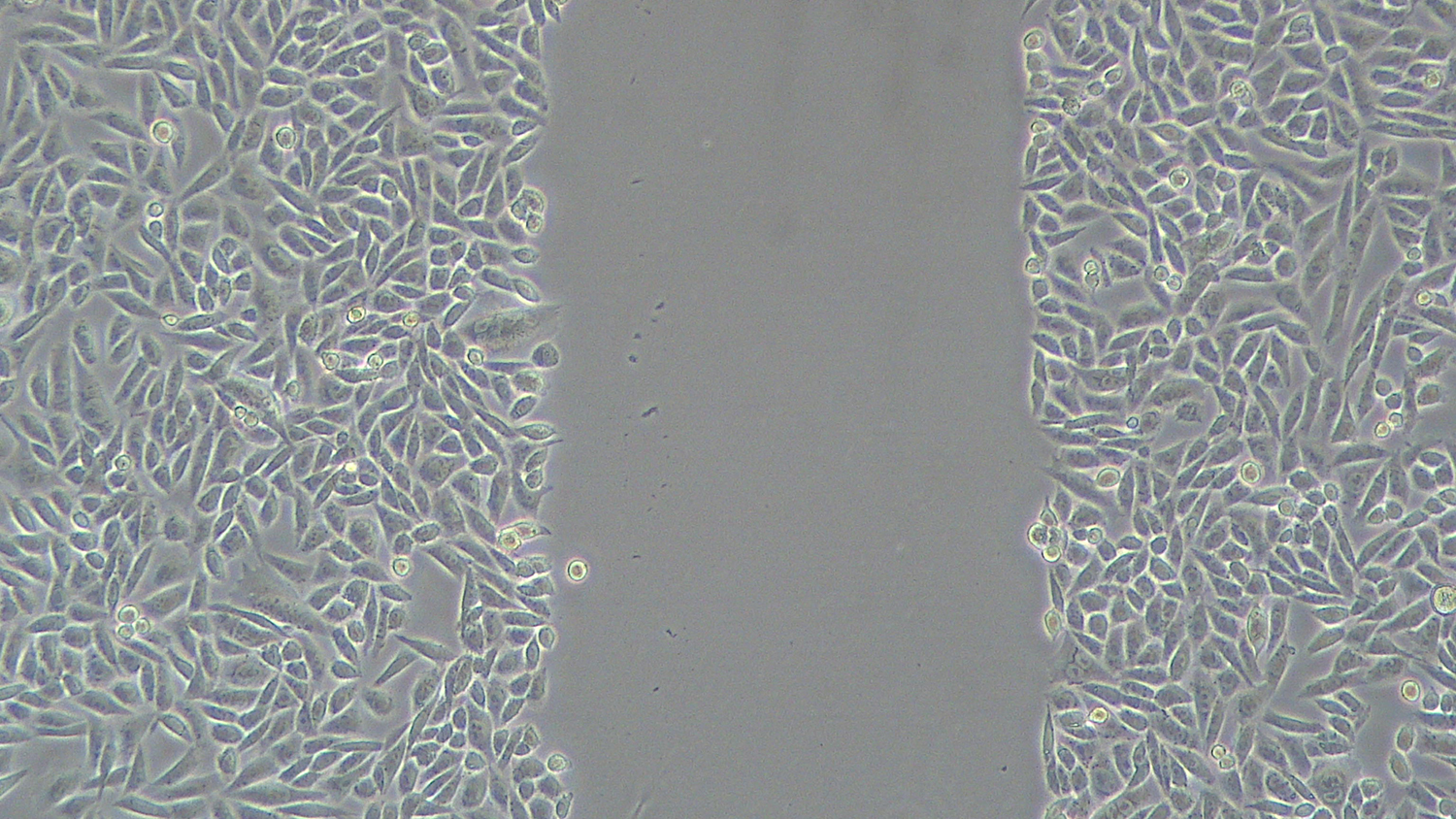 细胞划痕法是简单易行的检测肿瘤细胞运动特性的方法之一。其借鉴体外细胞致伤愈合实验模型,在体外培养的单层细胞上,划痕致伤,然后加入药物或者通过过表达或者干扰其基因表达观察其抑制肿瘤细胞迁移的能力。