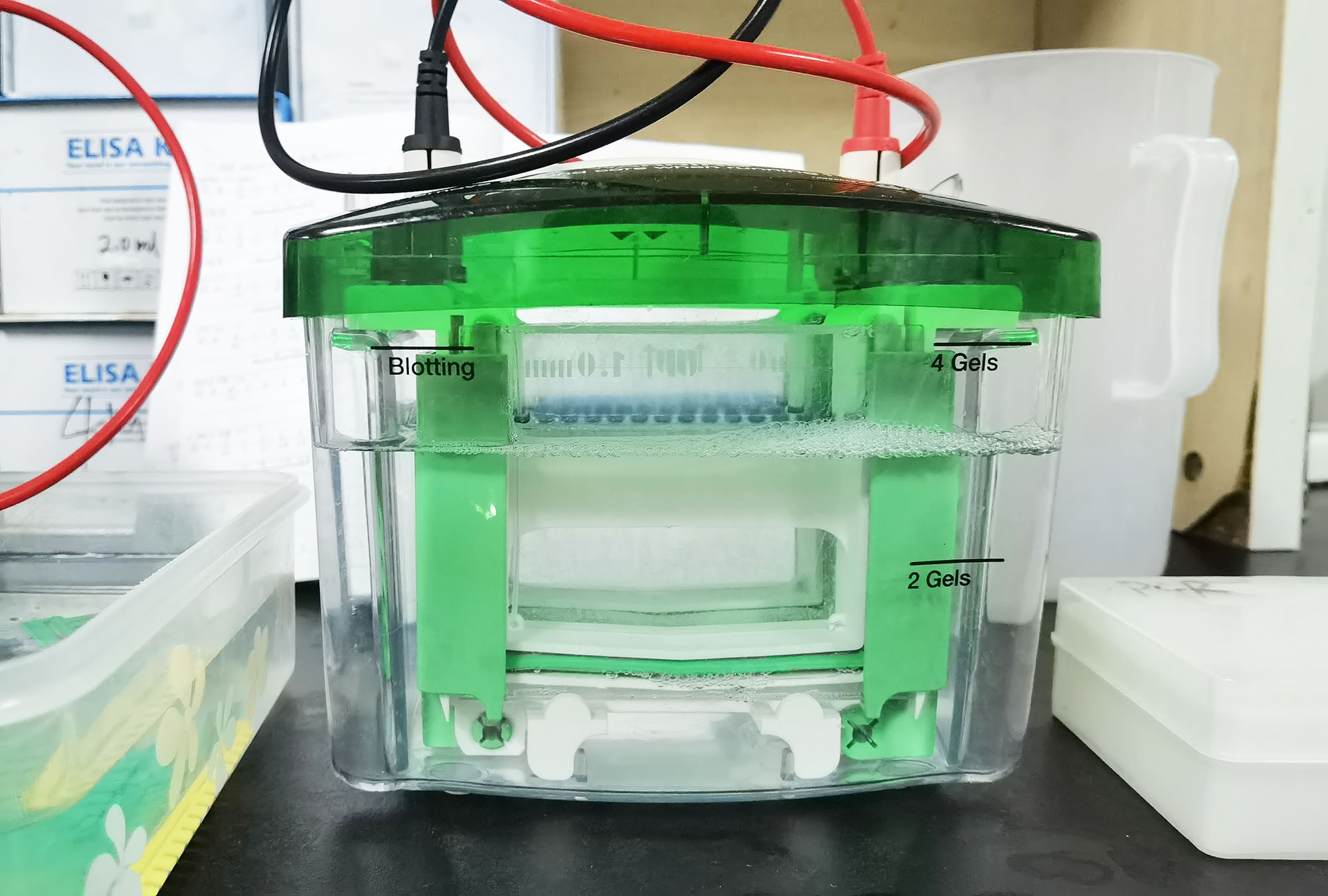一般浓缩胶80V 20分钟,分离胶120V 60分钟,可以根据具体实验要求调整电压和时间。当染料到达胶底部时切断电源,停止电泳,进行下一步转膜。
